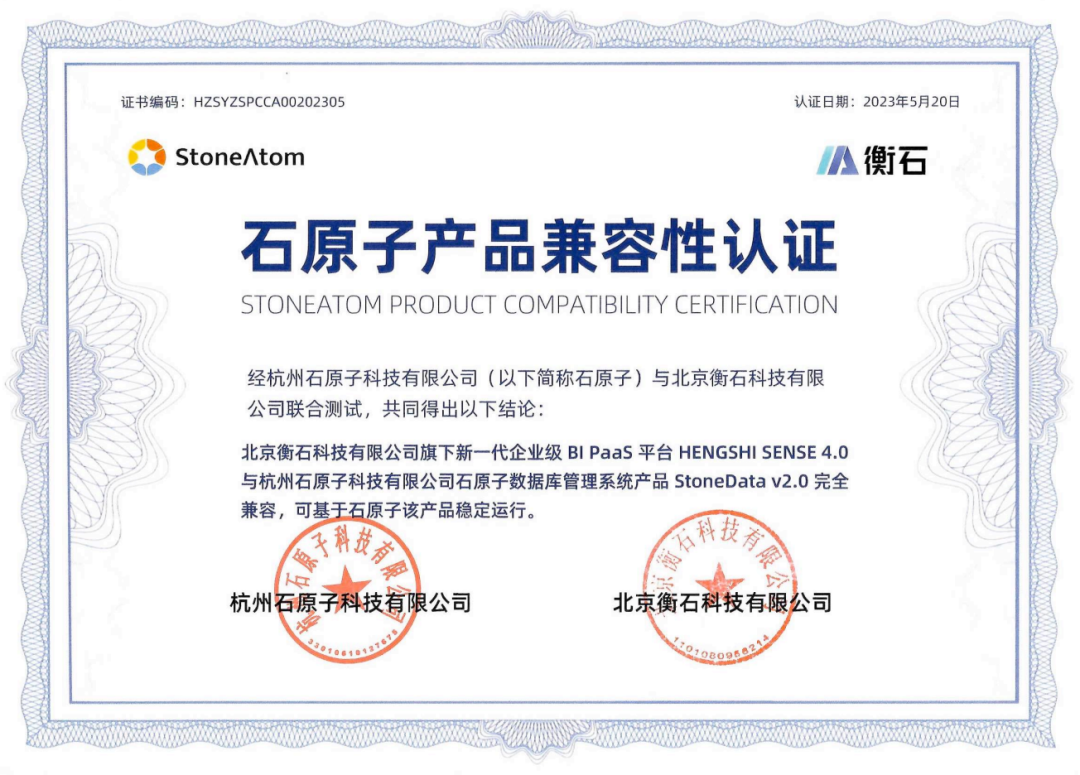 近日,北京衡石科技有限公司(以下简称“衡石科技”)与杭州石原子科技有限公司(以下简称“石原子科技”)完成了产品兼容性测试。经双方共同严格测试验证,衡石科技旗下新一代企业级BI PaaS平台 HENGSHI SENSE 4.0 与石原子科技旗下新一代离在线一体化实时数仓产品 StoneData 2.0 完全兼容,其功能、性能和兼容性等各方面表现良好,运行稳定、安全,能够满足企业落地敏捷分析及提升分析性能的需求。