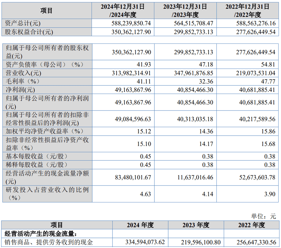 2022年至2024年,长江能科的营业收入分别为21,907.35万元、34,796.19万元、31,398.23万元;净利润/归属于母公司所有者的净利润分别为4,068.19万元、4,085.45万元、4,916.39万元;归属于母公司所有者的扣非净利润分别为4,021.76万元、4,031.30万元、4,908.46万元。