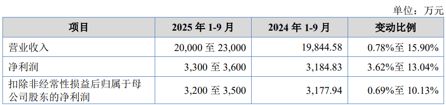 公司预计2025年1-9月的营业收入为20,000万元至23,000万元,变动比例0.78%至15.90%;净利润为3,300万元至3,600万元,变动比例3.62%至13.04%;扣除非经常性损益后归属于母公司股东的净利润为3,200万元至3,500万元,变动比例0.69%至10.13%。