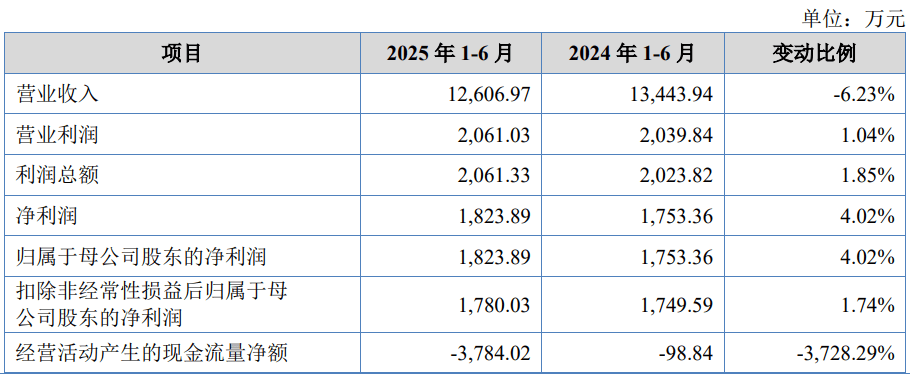 2025年1-6月,长江能科的营业收入为12,606.97万元,同比下降6.23%;净利润/归属于母公司股东的净利润为1,823.89万元,同比增长4.02%;扣除非经常性损益后归属于母公司股东的净利润1,780.03万元,同比增长1.74%;经营活动产生的现金流量净额-3,784.02万元,上年同期为-98.84万元。