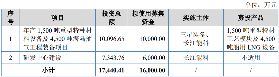 本次发行超额配售选择权行使前,长江能科募集资金总额为15,990.00万元,扣除发行费用后的募集资金净额为13,561.04万元,比原计划少2,438.96万元。长江能科2025年9月22日披露的招股书显示,公司拟募集资金16,000.00万元,用于年产1,500吨重型特种材料设备及4,500吨海陆油气工程装备项目、研发中心建设。