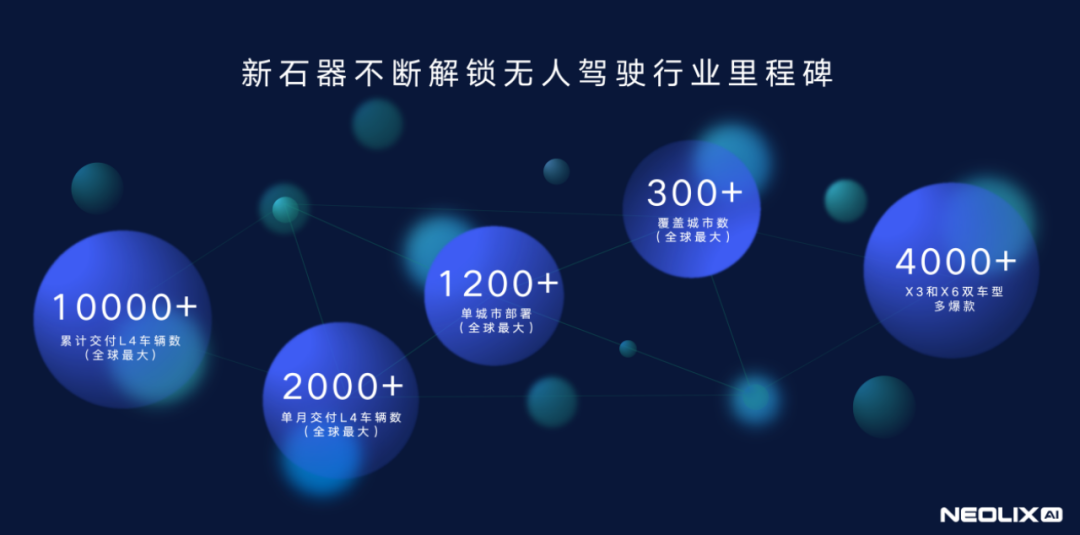 自 2018 年成立以来,新石器持续领跑 RoboVan 行业,并且近期实现了多个里程碑:累计交付 L4 自动驾驶车辆突破 1 万台车,成为全球第一家破万台的 L4 级车队;单月交付车辆突破 2000 台,成为全球首家单月突破 2000 台的自动驾驶公司;在青岛市部署车辆突破 1200 台,协助其成为全球无人驾驶车辆最多的城市;X3 和 X6 车型累计交付数均突破 4000 台,成为行业中唯一实现多爆款(大规模交付 SKU )批量交付的公司;部署车辆城市数突破 300 个,成为全球城市覆盖最多的自动驾驶公司;无人车累计 L4 自动驾驶里程已率先突破 5000 万公里,持续领先行业。