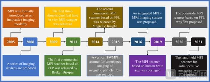MPI发展历程[1]历经二十年的发展,MPI技术已从最初的概念阶段逐步发展到原型设备制造和动物实验阶段。然而,但其临床转化仍面临关键瓶颈——传统封闭式磁场结构限制了成像空间的自由度与适用场景。