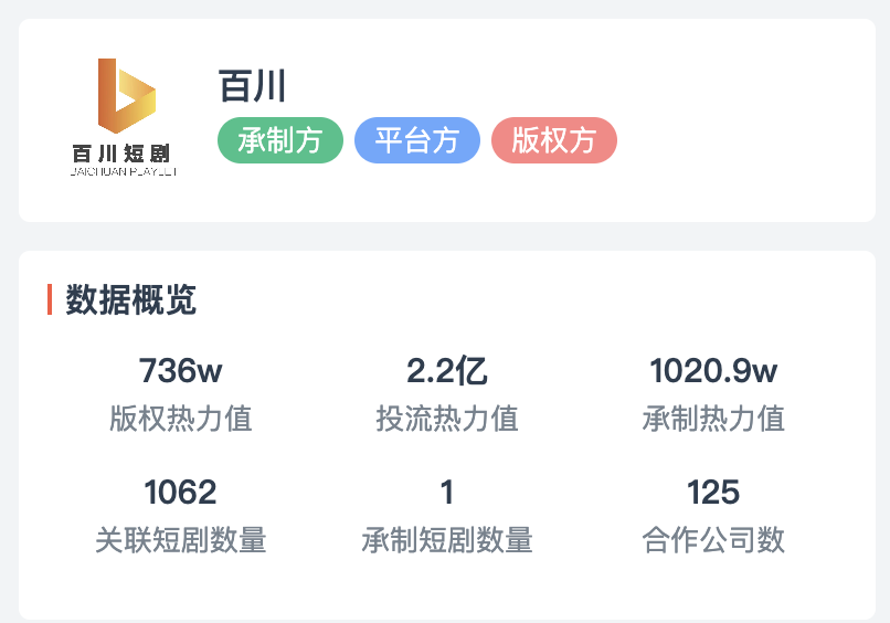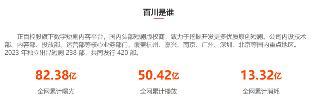 根据浙江出海官网,百川是国内头部短剧版权商,旗下作品全网累计曝光超82亿,累计播放超50亿次,累计消耗超13亿。