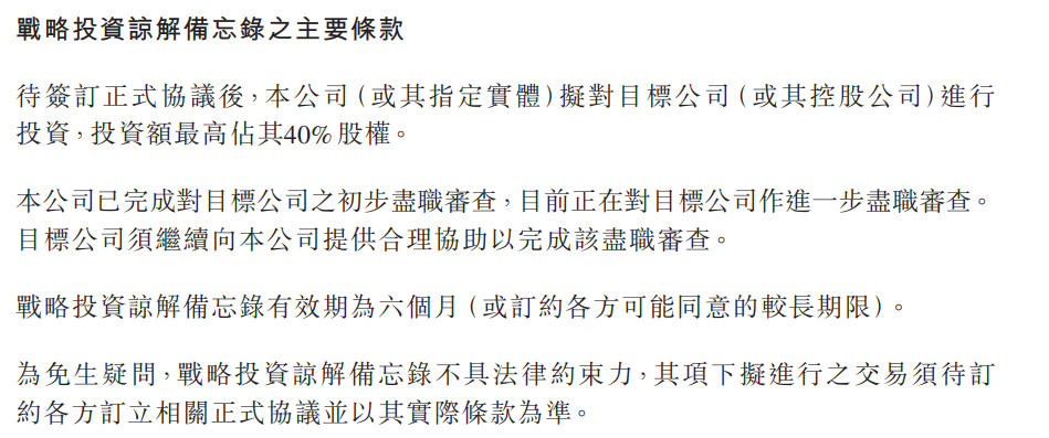 11月18日,港股上市公司小鱼盈通发布公告,宣布与浙江出海数字技术有限公司订立战略投资谅解备忘录。待正式协议签署后,小鱼盈通拟对浙江出海进行投资,对应股权比例最高可达40%。