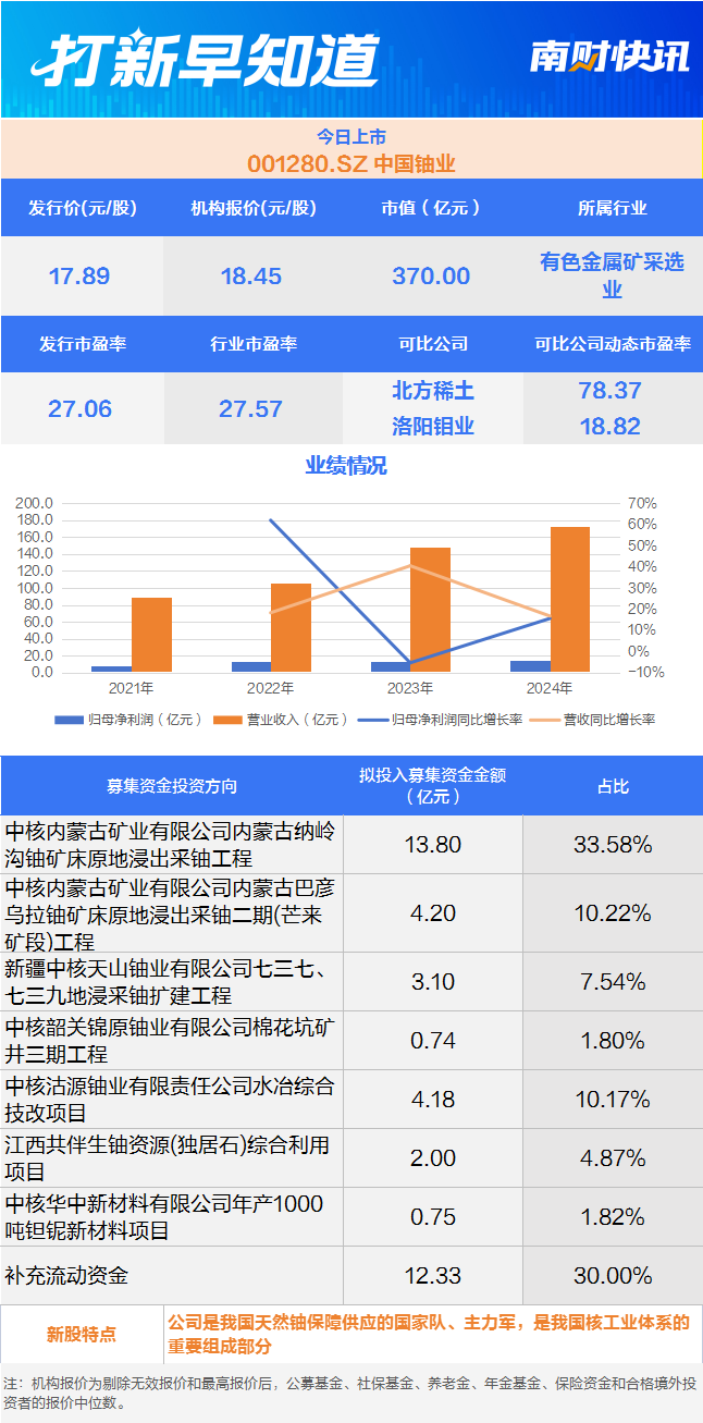 12月3日,有一只新股上市,为深市主板的中国铀业(68.250, 50.36, 281.50%)(001280.SZ)。中国铀业是专注于天然铀和放射性共伴生矿产资源综合利用业务的矿业公司,主要从事天然铀资源的采冶、销售及贸易,以及独居石、铀钼、钽铌等放射性共伴生矿产资源综合利用及产品销售。同时,公司也是年内A股IPO募资金额第三大的新股。
