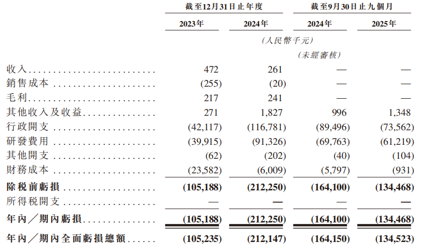 招股书显示,华芢生物在2023年、2024年以及2025 年前 9 个月,净亏损分别为人民币1.05 亿元、2.12 亿元、 1.34 亿元(合计约4.5亿元)。其中,绝大部分亏损由研发费用及行政开支导致。截至 2025 年 9 月 30 日,华芢生物现金及现金等价物余额为 7379 万元。