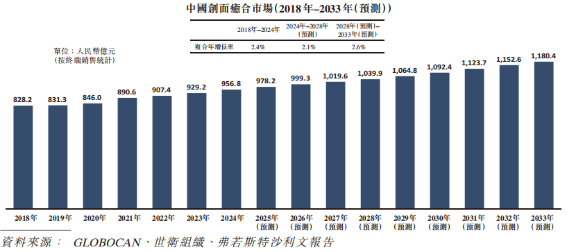 成立以来,华芢生物的主攻方向一直是发现、开发和商业化伤口愈合的疗法,尤其是PDGF药物。PDGF是血小板在损伤后分泌的生长因子之一,其能促进(其中包括)新血管的生成、调节炎症并刺激细胞增殖和迁移,最终加速伤口的愈合。根据弗若斯特沙利文报告,中国伤口愈合药物的市场规模从2018年的人民币828亿元增加至2024年的人民币957亿元,预计2033年将达到人民币1,180亿元。
