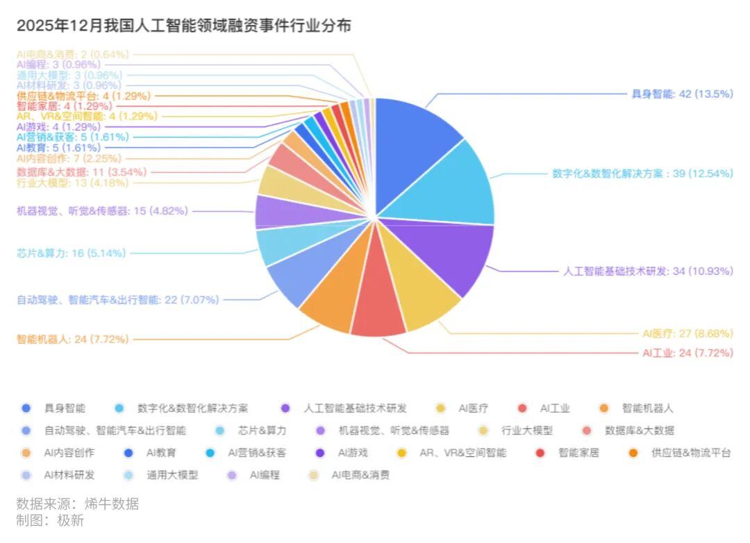 图二:2025年12月我国人工智能领域投融资事件各细分行业统计(数据来源:烯牛数据)