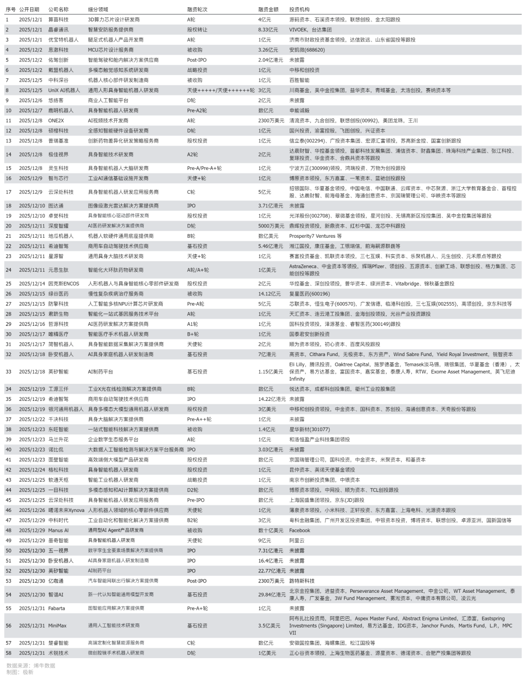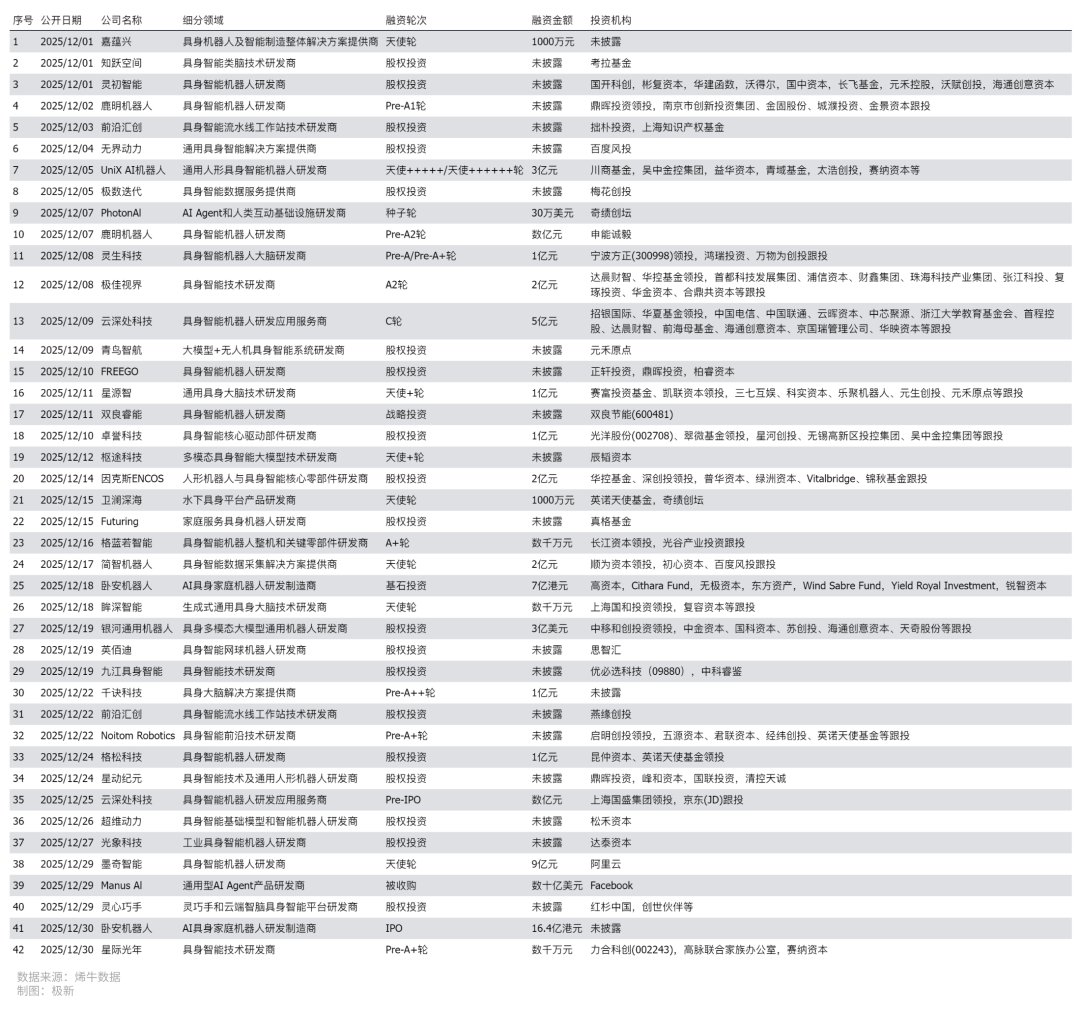 其中,12月具身智能领域投融资事件共42起,相比11月增加26起。
