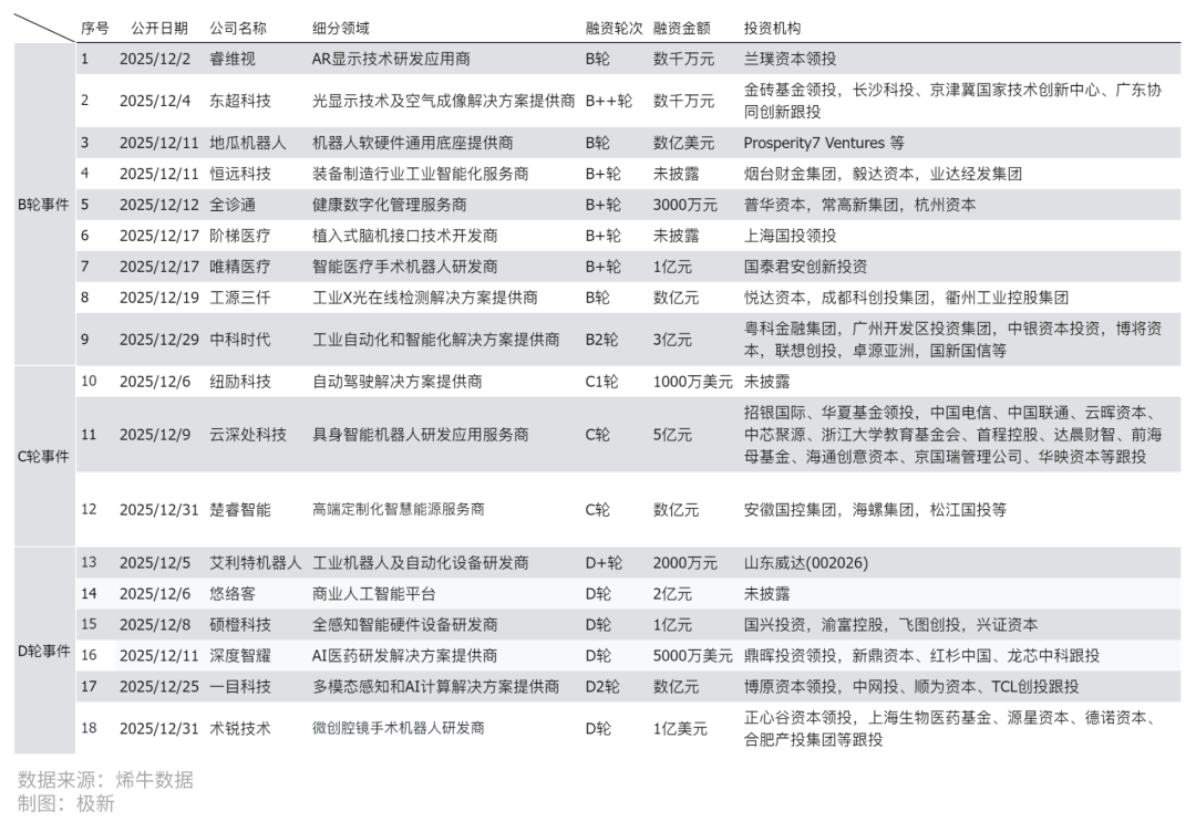图三:2025年12月我国人工智能-具身智能领域投融资事件统计(数据来源:烯牛数据)