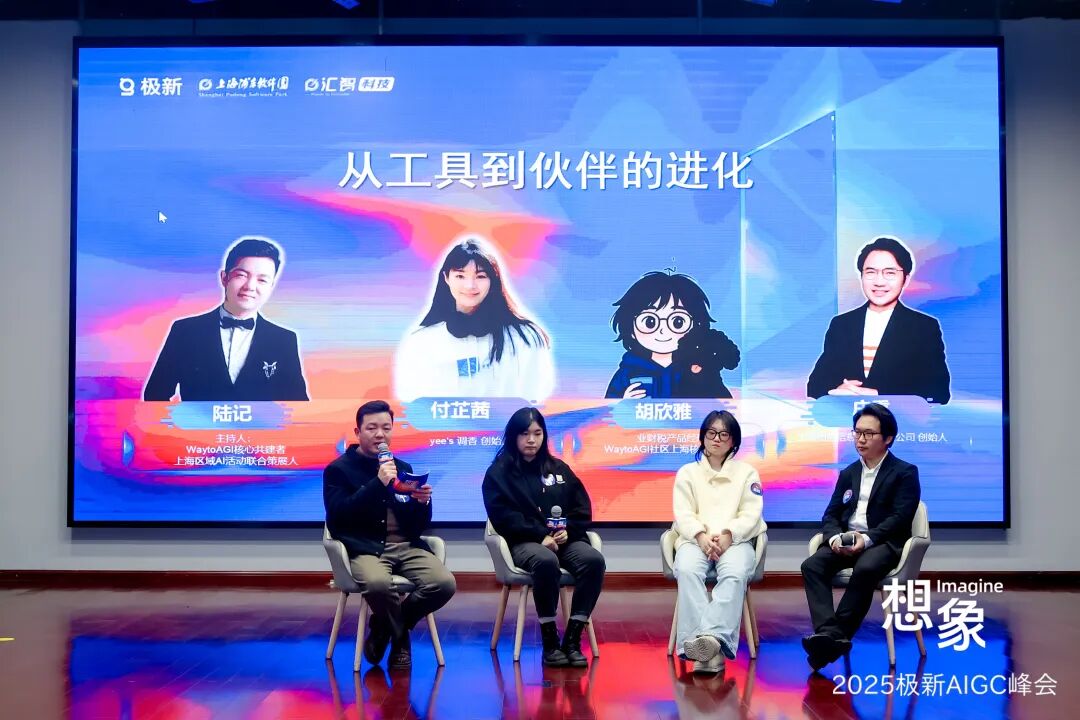 2025年12月26日,【想象·2025极新 AIGC 峰会】在上海浦东浦软大厦成功举办。WaytoAGI核心共建者&AI策展人陆记、yee's调香创始人付芷茜、业财税产品经理&WaytoAGI共建者胡欣雅、上海图漫信息创始人庄重在会上进行了题为《AI从工具到伙伴的进化》的圆桌讨论。四位来自品牌创意、科技普惠、复杂系统产品等不同领域的嘉宾,围绕AI如何从效率工具进化为人类想象伙伴的核心议题,展开了深入对话。讨论聚焦于AI在真实场景中的落地挑战、效果量化、责任共担等关键问题,为现场观众带来了前沿的洞察与实践案例,引发阵阵掌声与思考。