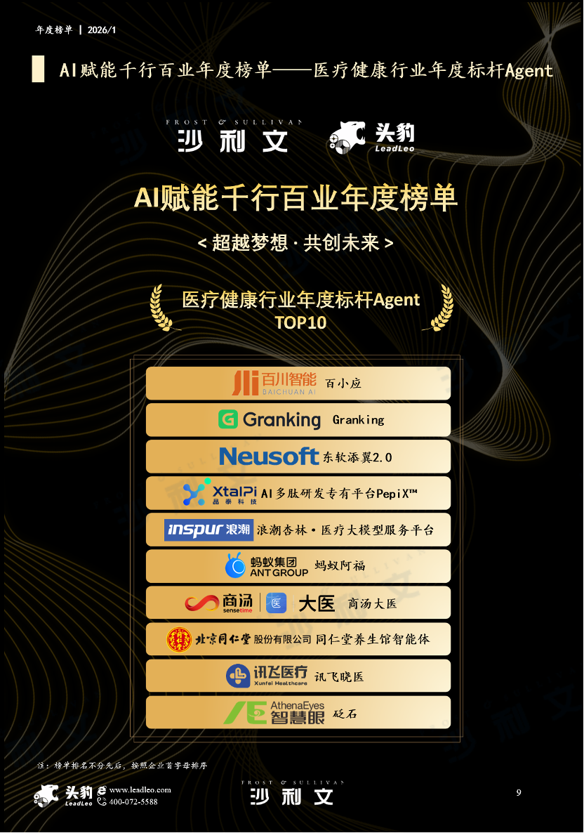 这次评选极为严格,由全球知名咨询机构弗若斯特沙利文(Frost & Sullivan)联合头豹研究院发布,近百位行业专家从近300个参评AI Agent中,围绕技术的原创性、场景应用的实效性与行业影响力等多个维度评审遴选。东软“添翼”AI 2.0与蚂蚁阿福、讯飞晓医等一同入选医疗健康行业年度标杆TOP10,共同代表了中国医疗AI应用的最佳实践,为行业智能化转型提供重要参考。