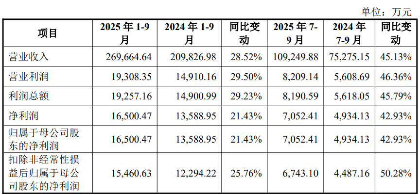 2025年1-9月,公司实现营业收入269,664.64万元,同比增长28.52%;实现净利润/归属于母公司所有者的净利润16,500.47万元,同比增长21.43%;扣除非经常性损益后归属于母公司股东净利润15,460.63万元,同比增长25.76%。