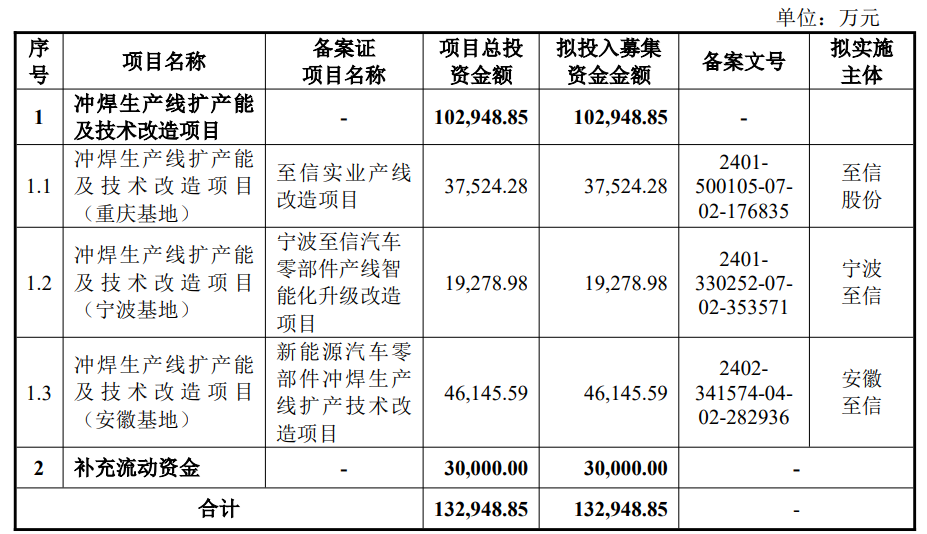 至信股份本次发行募集资金总额123,986.67万元,扣除发行费用后的募集资金净额为112,655.21万元,比原计划少20,293.64万元。公司2026年1月12日披露的招股书显示,公司拟募集资金132,948.85万元,用于冲焊生产线扩产能及技术改造项目、补充流动资金项目。
