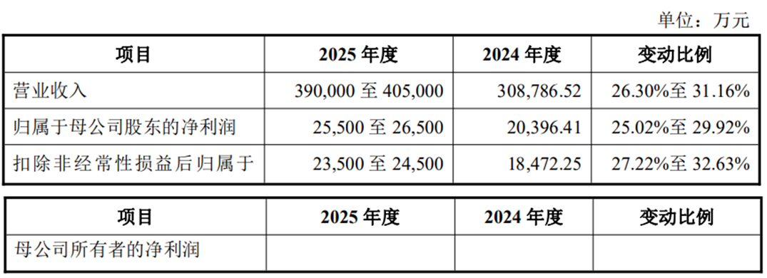 公司预计2025年度营业收入390,000万元至405,000万元,变动比例26.30%至31.16%;归属于母公司股东的净利润25,500万元至26,500万元,变动比例25.02%至29.92%;扣除非经常性损益后归属于母公司所有者的净利润23,500万元至24,500万元,变动比例27.22%至32.63%。