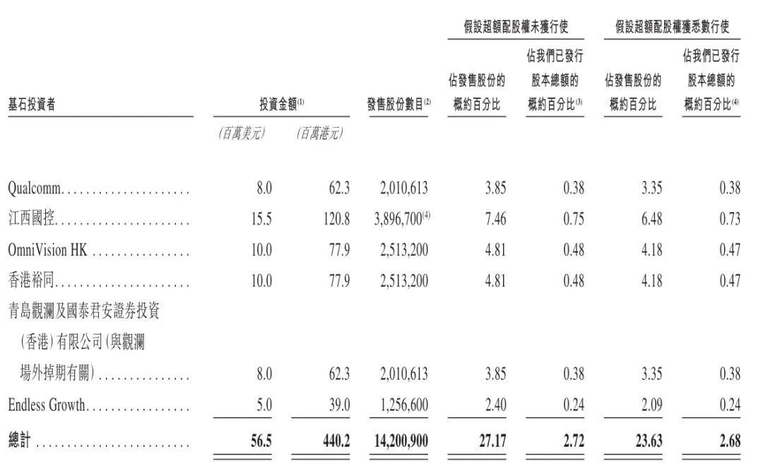 龙旗科技基石投资者分别为Qualcomm(高通)、江西国控、OmniVision、香港裕同、青岛观澜及国泰君安证券投资(香港)有限公司、Endless Growth,一共认购5650万美元。