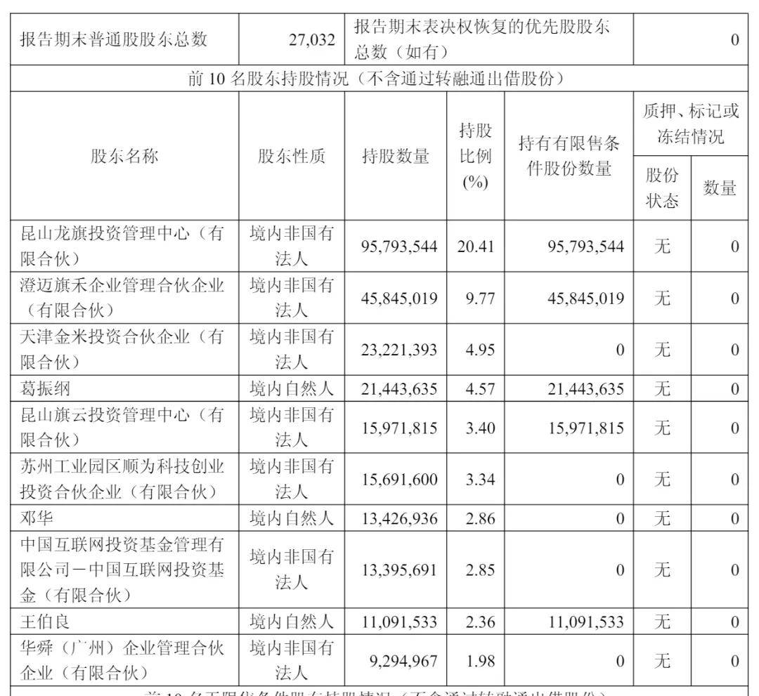 截至2025年9月30日,昆山龙旗持股为20.41%,昆山龙飞持股为9.77%,天津金米持股为4.95%,葛振纲持股为4.57%,昆山旗云投资管理中心(有限合伙)持股为3.4%;