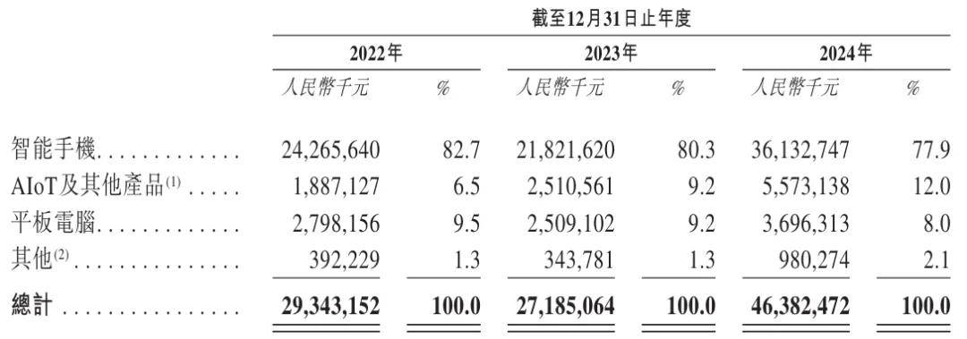 龙旗科技2024年来自智能手机业务的收入361.33亿,占营收的比例为77.9%;来自AIoT及其他产品收入55.73亿,占比为12%;来自平板电脑的收入为37亿元,占比为8%;来自其他的收入为9.8亿元,占比为2.1%。
