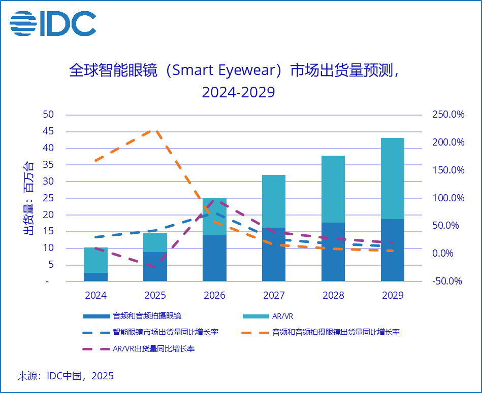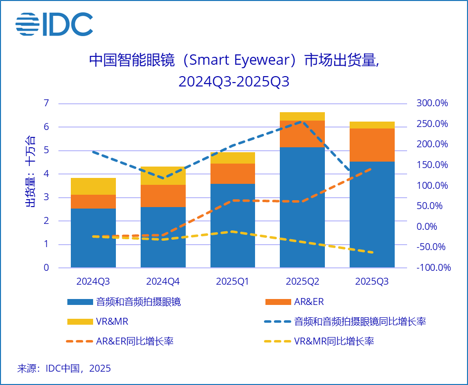 IDC的数据显示,2025年第三季度中国智能眼镜市场出货量为62.3万台,同比增长62.3%;全球智能眼镜市场出货量429.6万台,同比增长74.1%。
