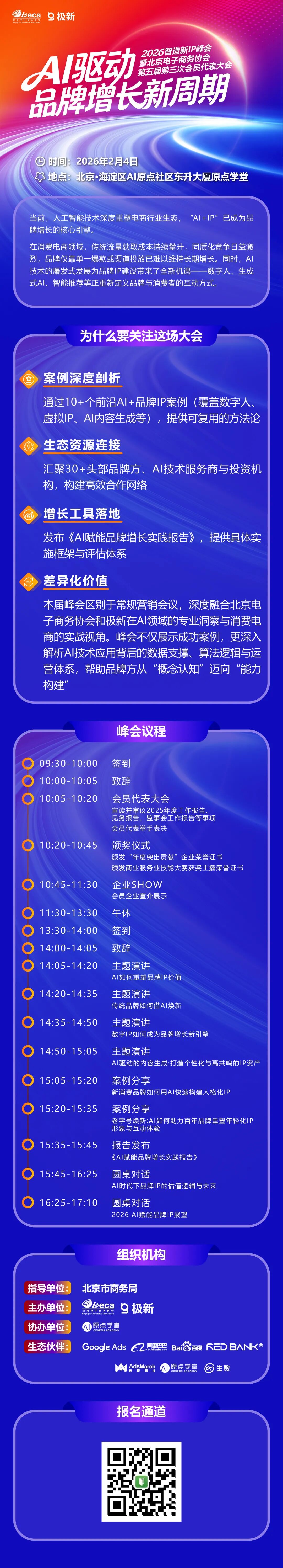 2月4日,由北京市商务局指导,北京电子商务协会、极新主办的“智造新IP:AI驱动品牌增长新周期”峰会暨北京电子商务协会第五届第三次会员代表大会,将在北京市海淀区AI原点社区东升大厦原点学堂举办,来自消费品、AI企业的数十位大咖,将从传统品牌焕新、AI重塑品牌价值及AI驱动品牌IP从流量到留量的实践等方面展开,共同找寻AI时代的品牌增长方法论与实战路径。