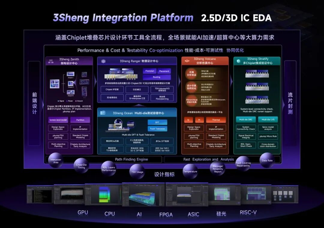 公司自主研发3Sheng Integration Platform(2.5D/3D堆叠芯片EDA平台),创新性构建了涵盖“系统级架构设计、物理实现、Multi die测试容错、分析仿真、多Chiplet集成验证”五大中心的闭环设计平台,支持一体化协同设计与优化,形成覆盖先进封装 Chiplet 后端设计全流程解决方案。目前,该平台系列产品已通过先进封装产业验证,打造了国内首批头部厂商落地案例,全方位助力AI、GPU、CPU、FGPA、硅光等各类芯片及终端应用领域发展。