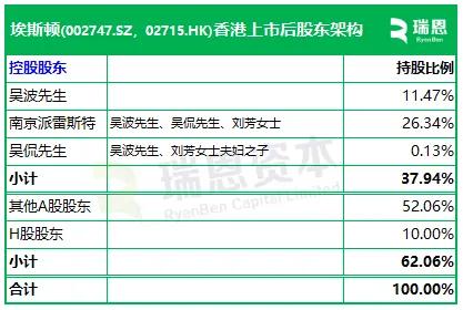 根据招股书披露,埃斯顿在香港上市后的股权架构中,吴波先生(直接持股11.47%)、刘芳女士夫妇、他们的儿子吴侃先生(直接持股0.13%)、南京派雷斯特(持股26.34%)(他们三人持有100%),合计持股约37.94%,为控股股东。