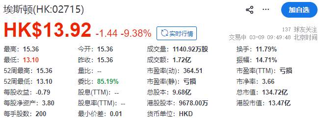 截至午间收市,埃斯顿每股收报13.92港元,目前总市值约134.72亿港元。