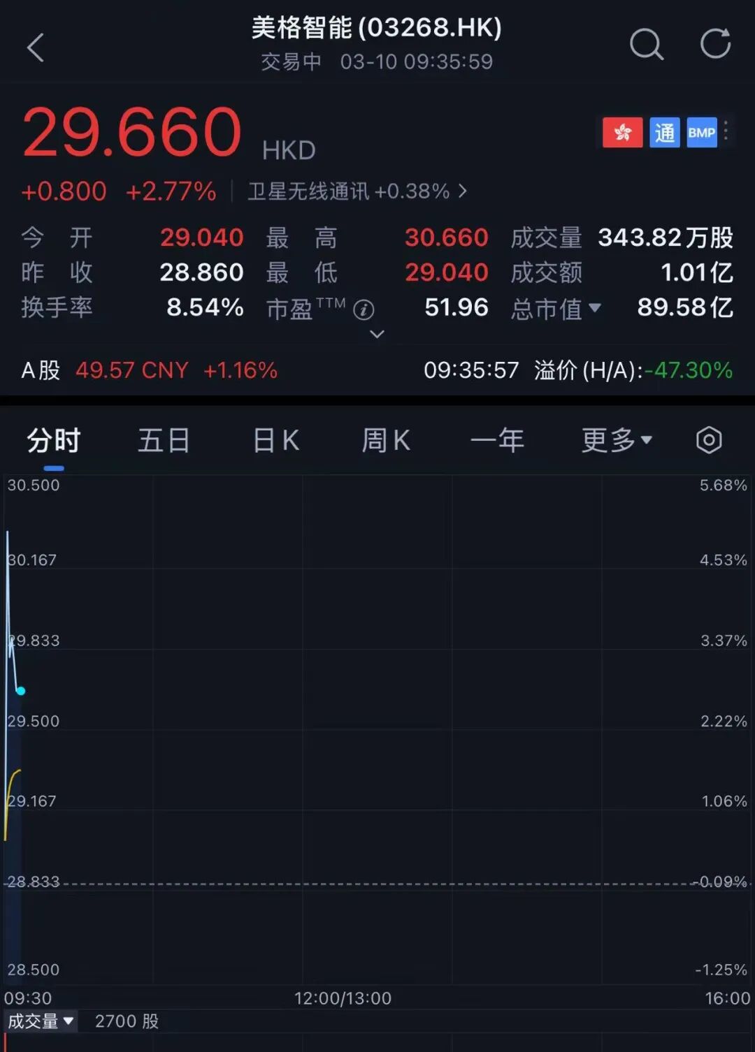 截至3月10日9点36分,美格智能股价为每股29.66港元(约合人民币26.21元),较发行价上涨2.77%,总市值89.58亿港元(约合人民币79.15亿元)。