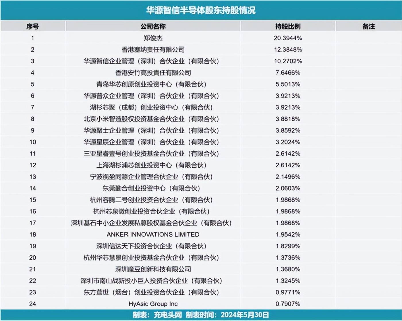 华源智信半导体公司目前共有股东24名。其中最大的股东是郑俊杰,持股比例为20.3944%;香港塞纳责任有限公司持股比例占比排第二,持股比例为12.3848%。